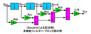 また、下図のようにA(0)・A(1)・A(2)・A(3)の機能ブロックを組み込み、定数の演算や遅延処理機能を追加することによって、様々なフィルター(ローパス・ハイパス・バンドパスなど)を実現することもできま す。定数や係数を自由に変更することも可能になります。