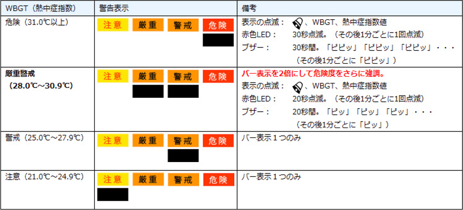 熱中症指数(WBGT)の警告表示とアラーム機能