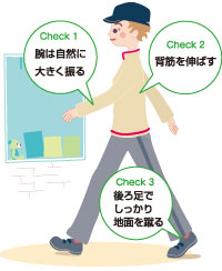ひざを伸ばしてかかとから着地するように歩くと、足への衝撃が少なく、筋肉を活発に動かすことができます。