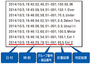 出力フォーマット:日付、時刻、グループ番号ー製品番号、計量結果、判定結果