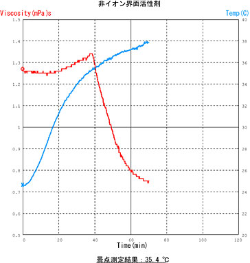SV-10を用いて、非イオン界面活性剤(濃度1%)を加熱しながら測定した結果を示します。グラフから、粘度の急激な変化が35.4℃で見られます。この温度が、曇点として測定されたことになります。